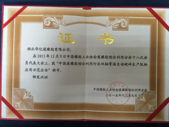 在2015年12月9日中國橡膠工業協會廢橡膠綜合利用分會十八次會員代表大會上,獲"中國橡膠綜合利用行業雙軸常溫自動破碎生產膠粉應用示範企業"稱號。